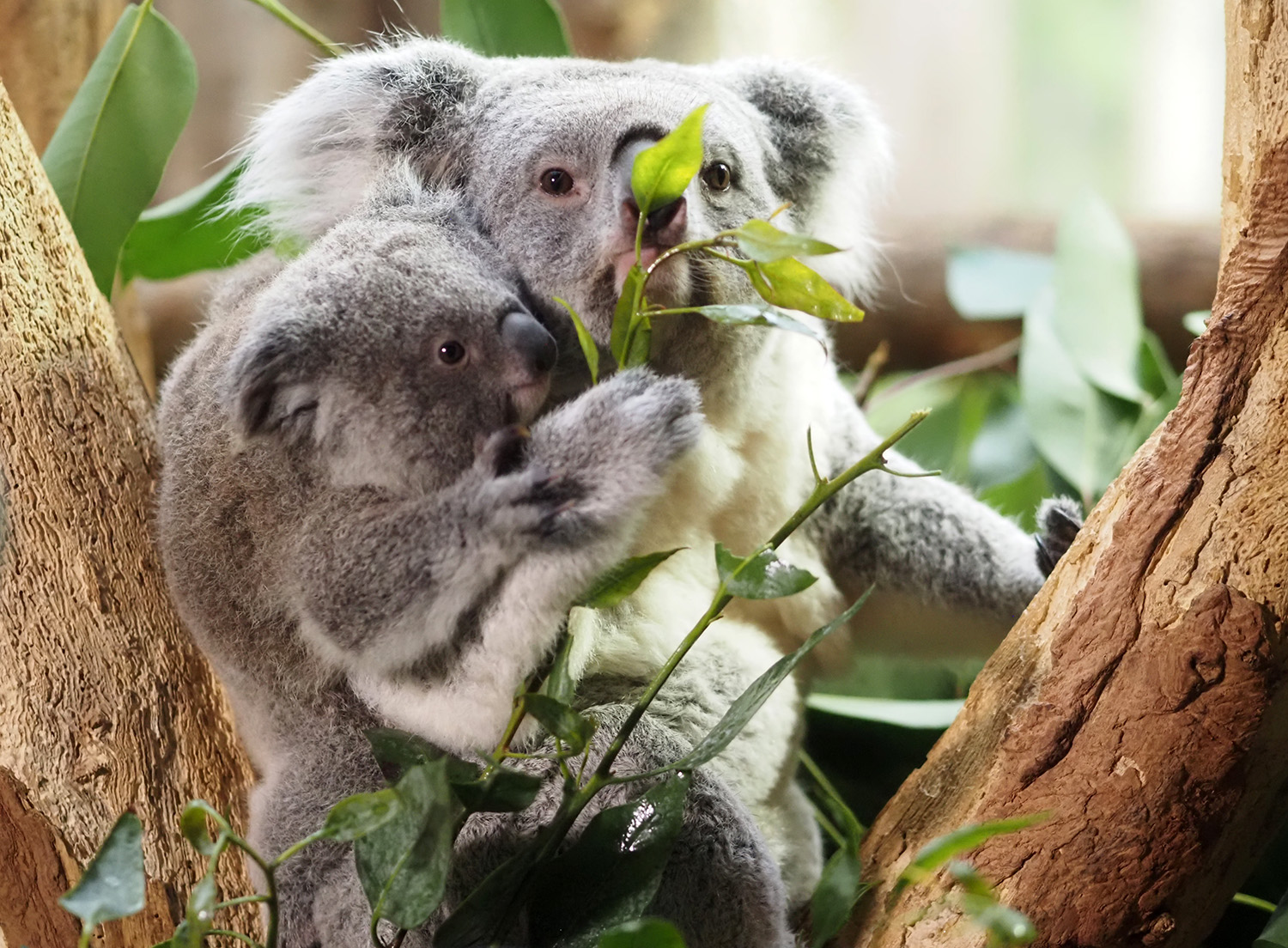 Die Tochter von Youma (5) und Erlinga hat sich seit ihrer Geburt im Frühsommer letzten Jahres bestens entwickelt. Sie zeigt sich zunehmend interessiert an ihrer Umgebung, wird lebhafter und kletterfreudiger und frisst bereits am Eukalyptus mit. Das Koalaweibchen ist als Erstgebärende eine äußerst liebevolle Mutter, die auch Vertrauen zu den Tierpflegern hat und zulässt, dass diese Inala bereits allein wiegen. Aktuell bringt sie 1100 Gramm auf die Waage.
