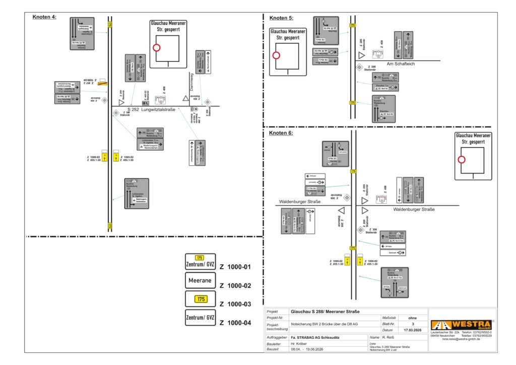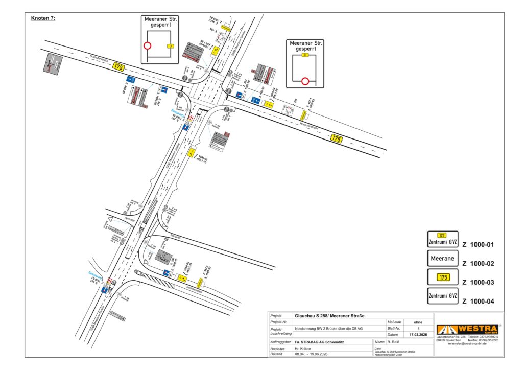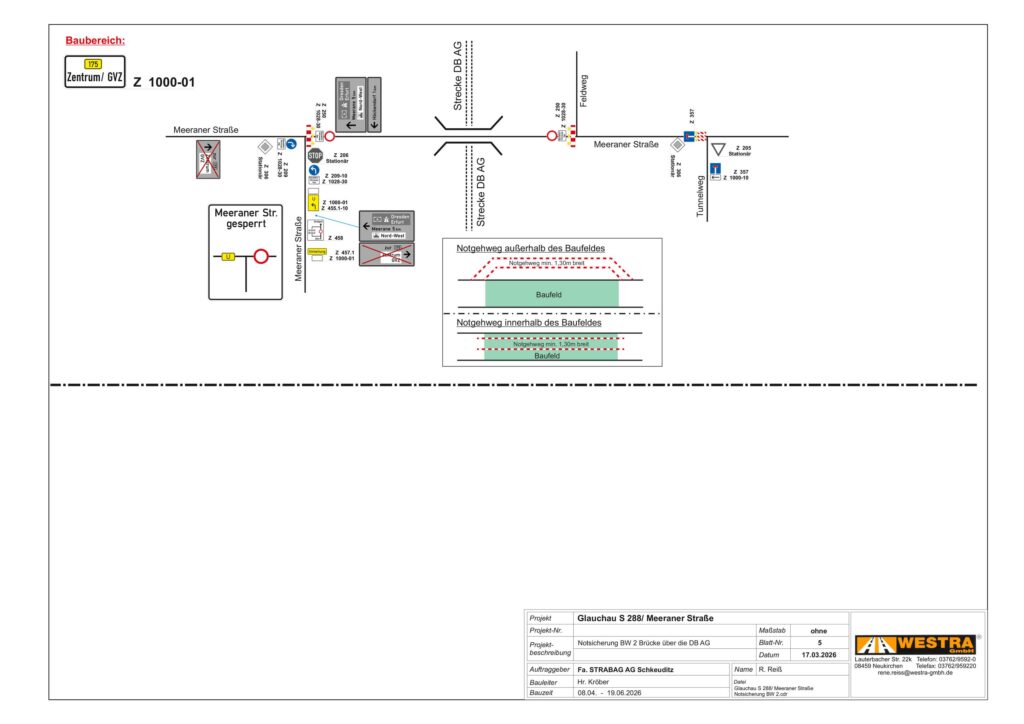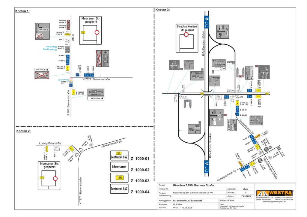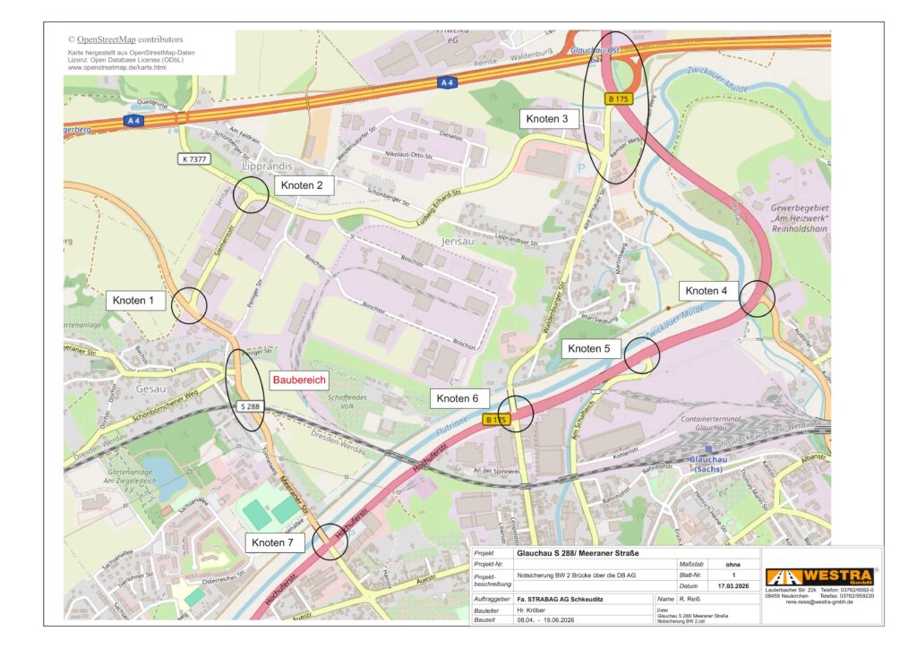 Wir weisen Sie für Ihre Planungen darauf hin, dass die Firma STRABAG AG Direktion Sachsen/Thüringen in der Zeit vom 08.04.2026 – 19.06.2026 die Notinstandsetzung des Brückenbauwerkes 2 auf der Meeraner Straße (S 288) plant.